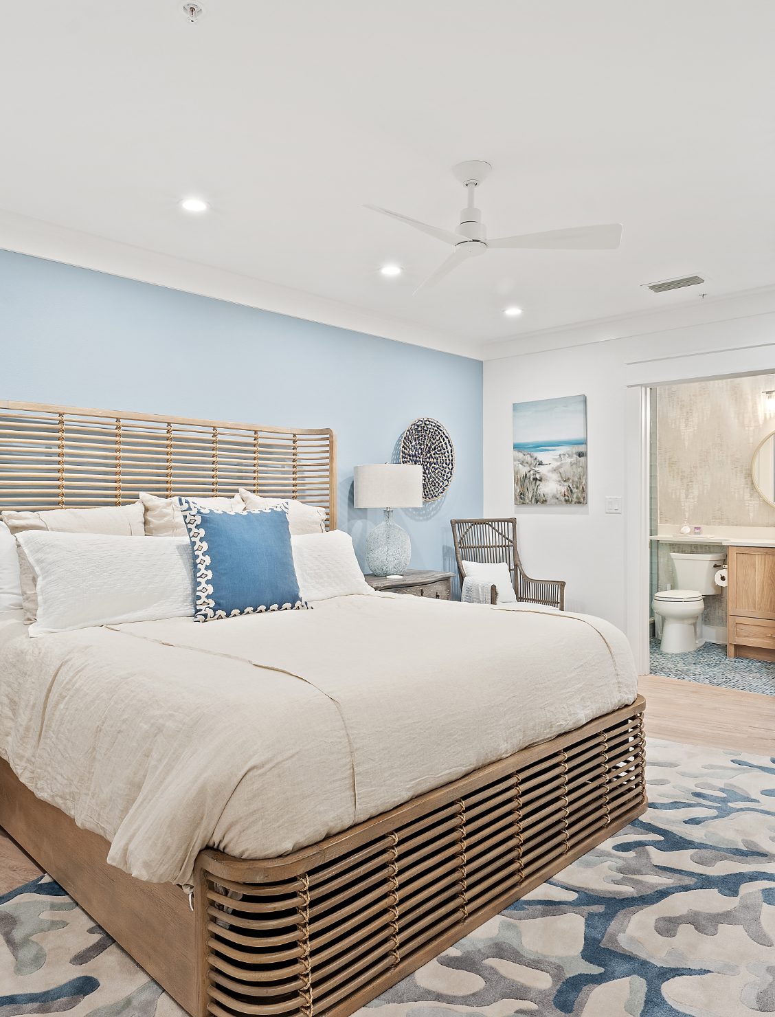 Electrical upgrades were a key component of the renovation. Fifty retro can lights with energy-efficient LED bulbs were installed and eight outlets with built-in USB charging ports were added throughout the space. Dimmable décor switches were incorporated to provide adjustable lighting options, while outlets for wall-mounted TVs were placed in all four bedrooms and the living room. Additionally, pendant lights were installed above the kitchen island. Three exhaust fans in bedrooms 2, 3, and 4 were replaced with models featuring dehumidifying capabilities, a small, but significant luxury for a beachfront condo.