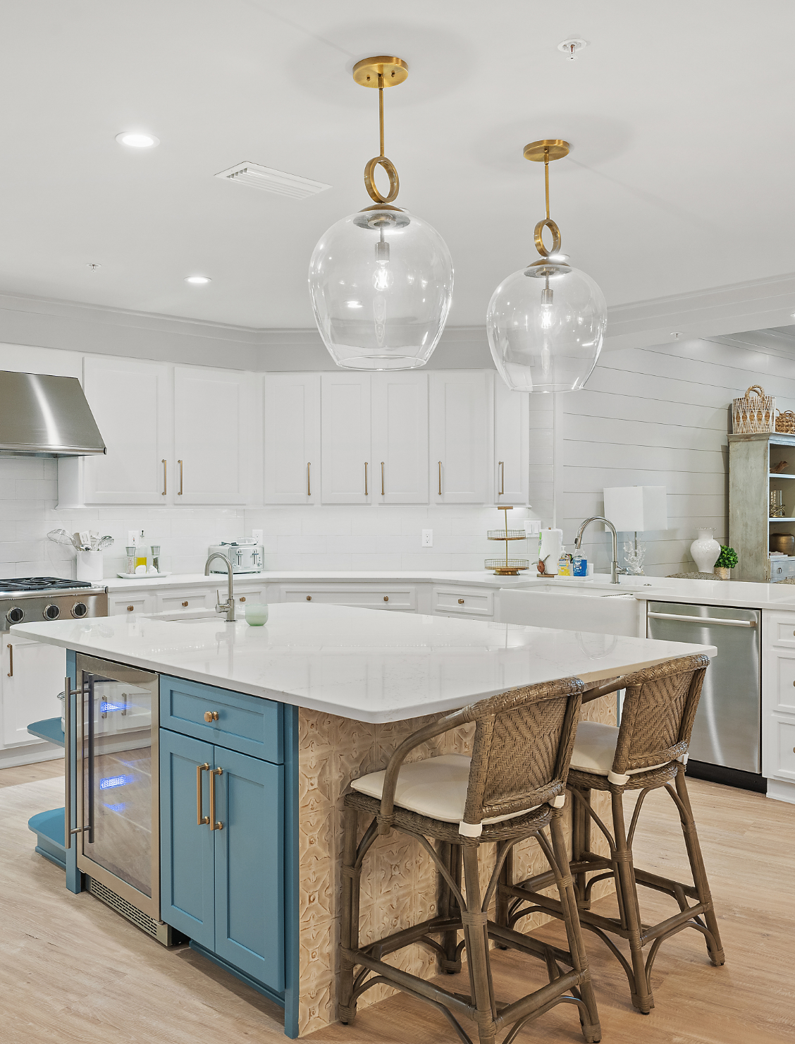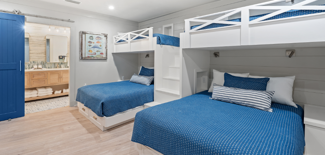 Blocking was incorporated for drapery hardware at all windows and a shower rod in bathroom #2. The built-in bunk bed area was adorned with shiplap siding, lending a touch of coastal charm.