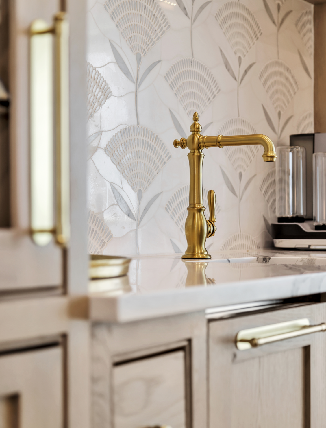 A notable feature of this renovation is the newly added wet bar, perfect for entertaining. Crafted with marble tile and quartz countertops, it creates an inviting ambiance, while glass acrylic shelving offers a chic display for fine spirits and glassware.