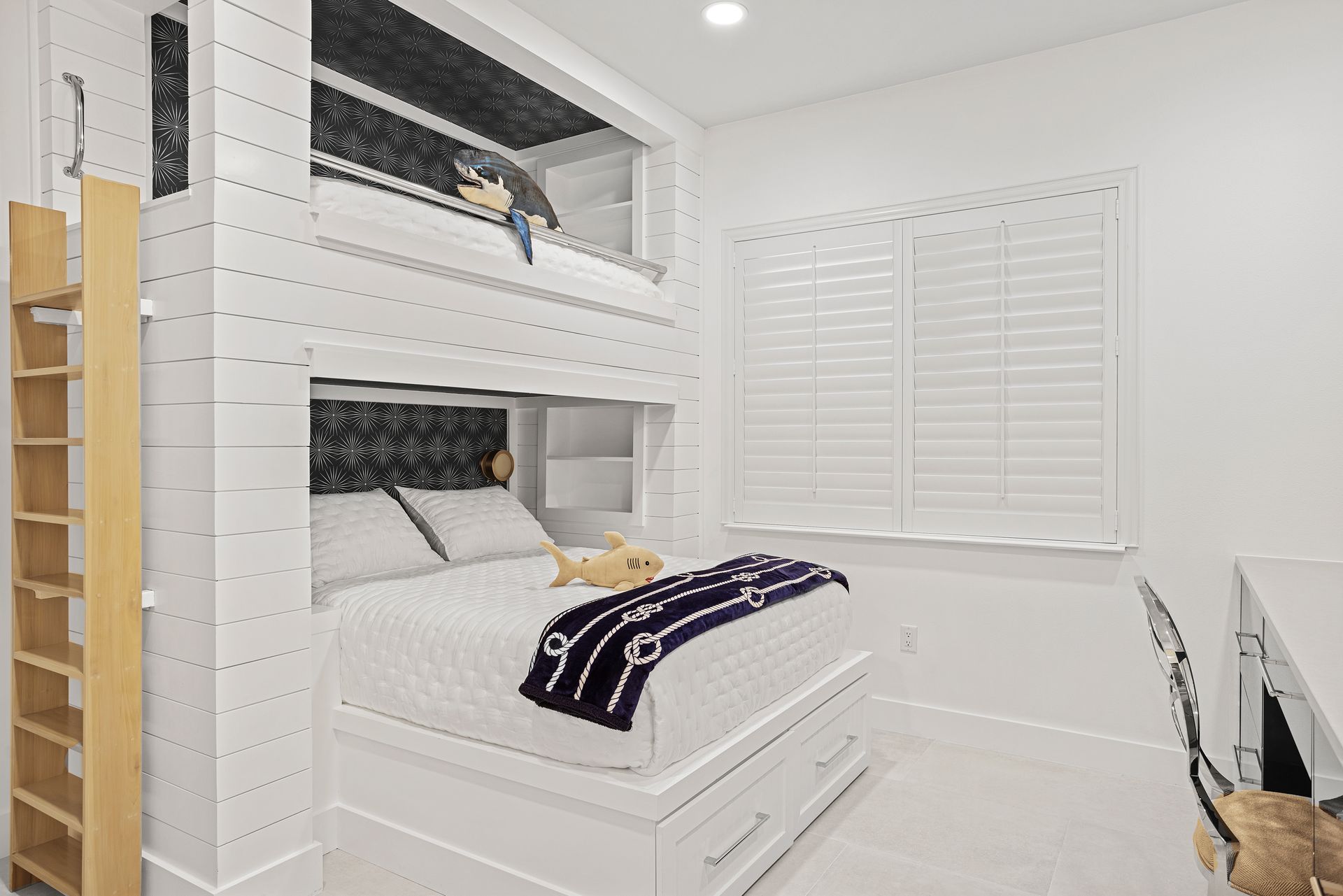 Each bedroom received thoughtful updates. The second bedroom now features new tile flooring, while its ensuite bathroom was upgraded with sleek shower glass, a new toilet, and updated vanity hardware. The third bedroom was redesigned with custom bunk beds, fresh tile flooring, freestanding tub with a gorgeous tile surround, a new toilet, and an updated vanity.