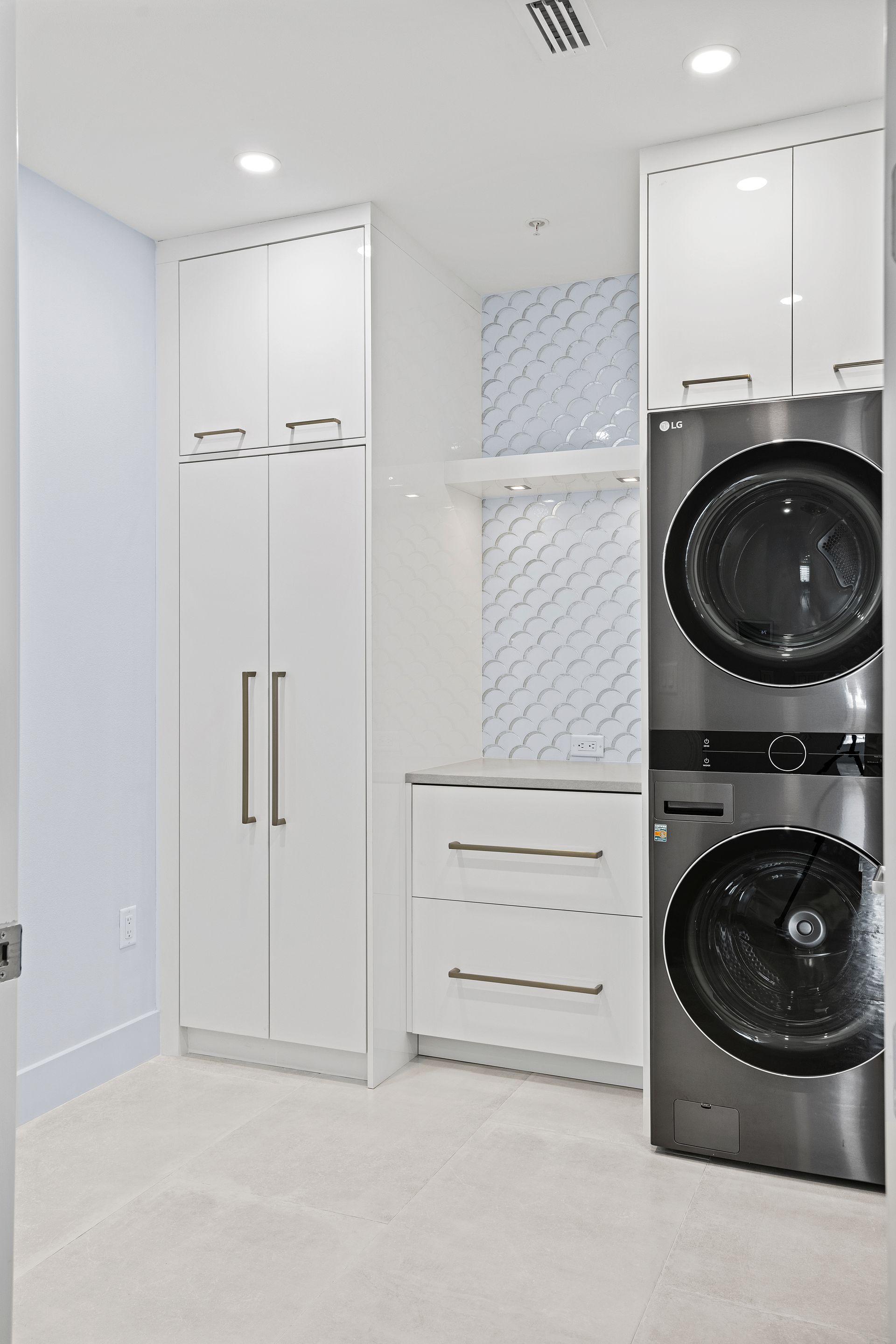 The laundry room was refreshed with new cabinetry, tile flooring, and upgraded appliances. A new washer and dryer were installed to enhance both convenience and style.