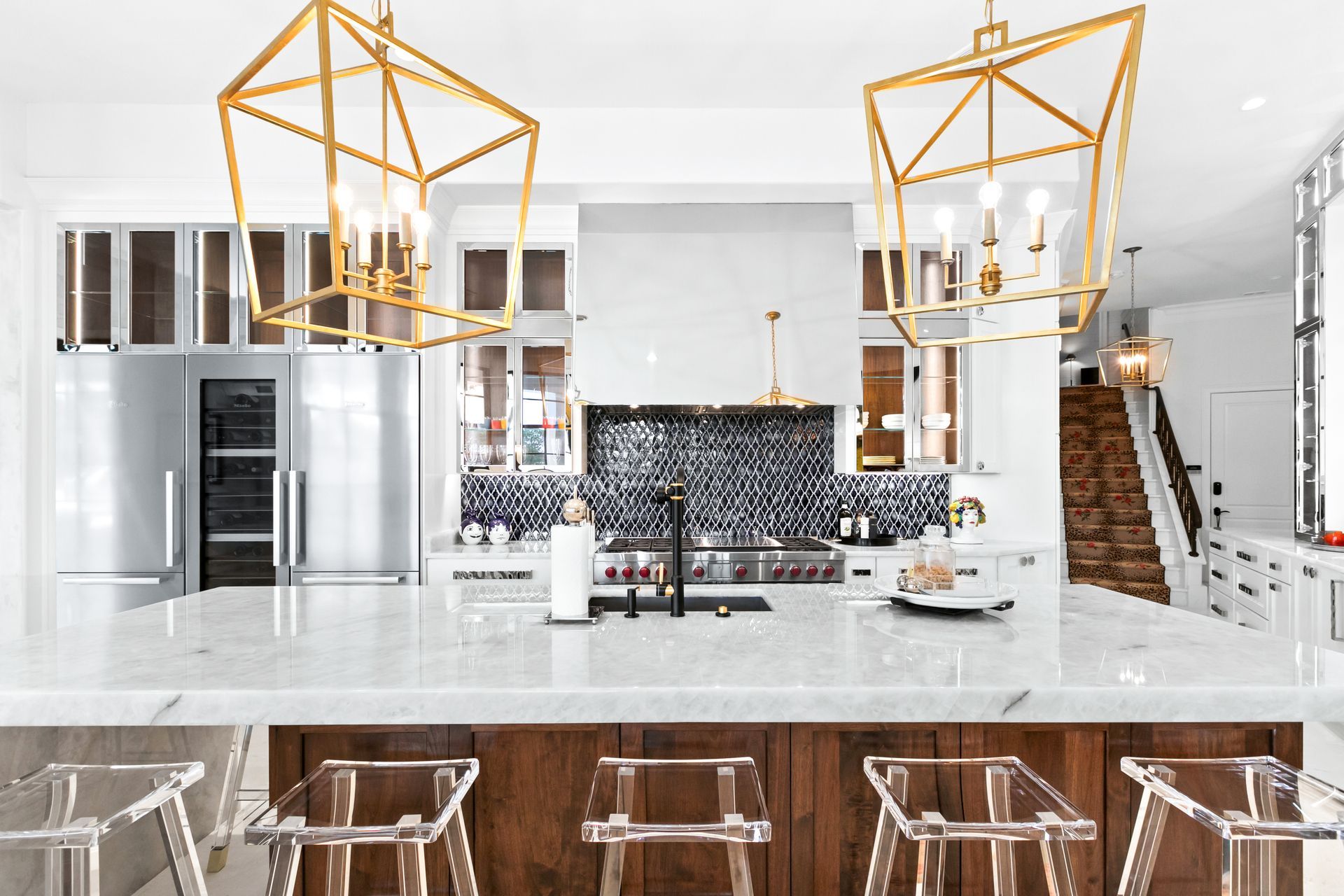 In the kitchen, a reworked layout featuring Cristallo quartzite countertops, new cabinetry, and a custom panel front on the refrigerator for a seamless look. A secondary sink was upgraded for both style and functionality. The surrounding cabinetry was also updated with new hardware and layout adjustments, including a built - in desk area that feels both intentional and integrated.