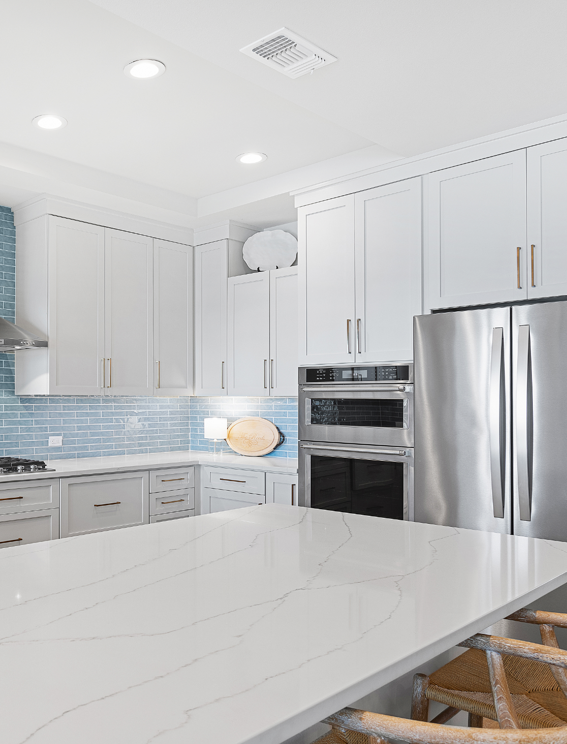 The kitchen received a complete makeover to ensure a seamless blend of beauty and functionality. A new pantry area near the foyer was created, featuring full-height cabinets for ample storage. The fridge was relocated to the old pantry location, making room for an oven, microwave, and warmer drawer unit. A new cooktop was installed, accompanied by a sleek hood, adding a modern touch to the cooking area.