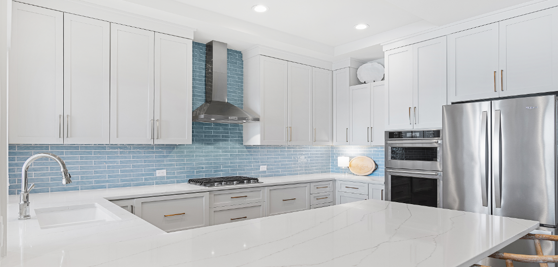 The upper cabinets, reaching the ceiling, mirror the profile of the base cabinets, maintaining a cohesive aesthetic. LED undercabinet lighting was thoughtfully added to enhance both the ambiance and functionality. The renovation also included a new sink, faucet, disposal, quartz countertops, and a stylish tile backsplash. While the appliances were provided by the owner, the installation was carried out with utmost care and precision.