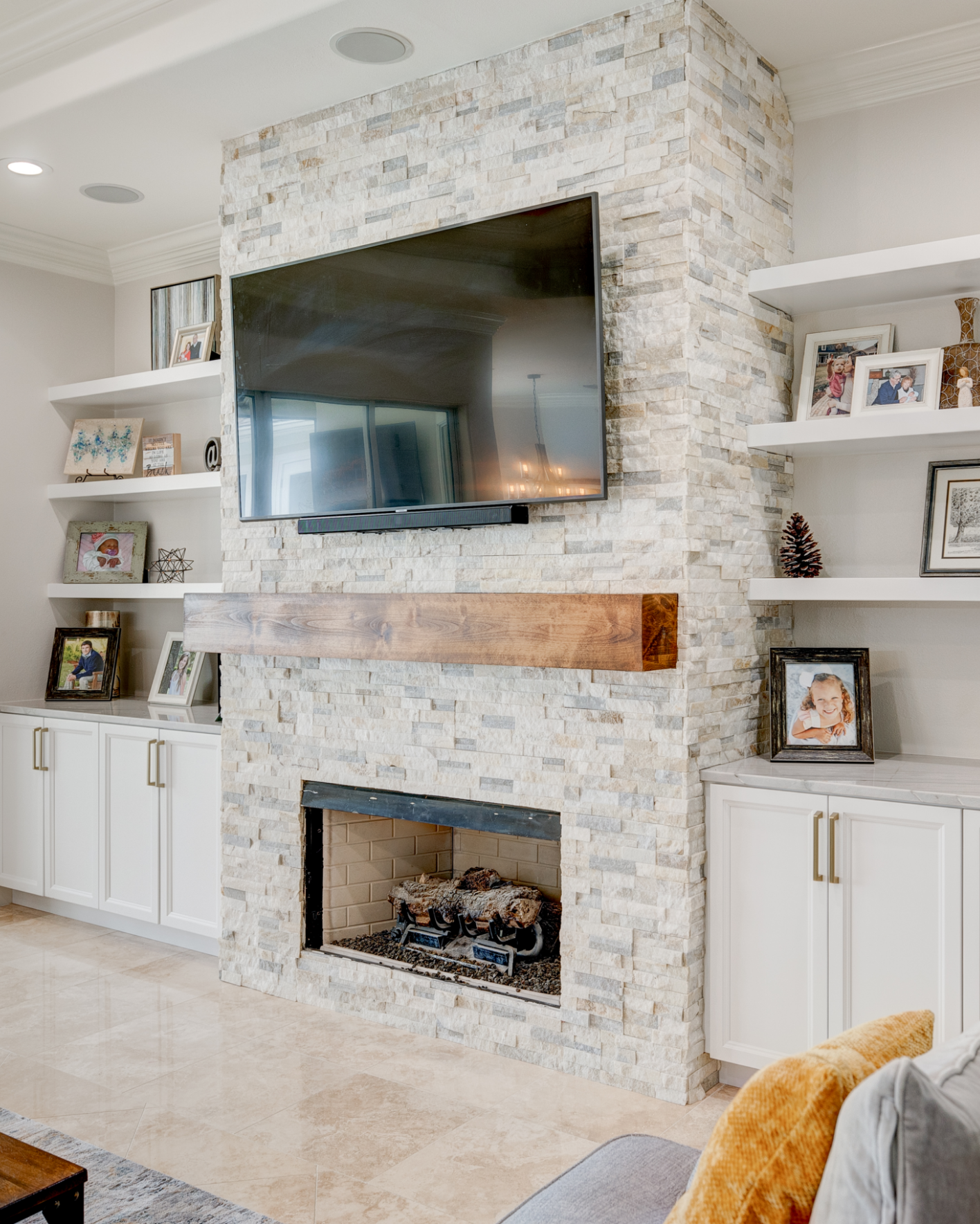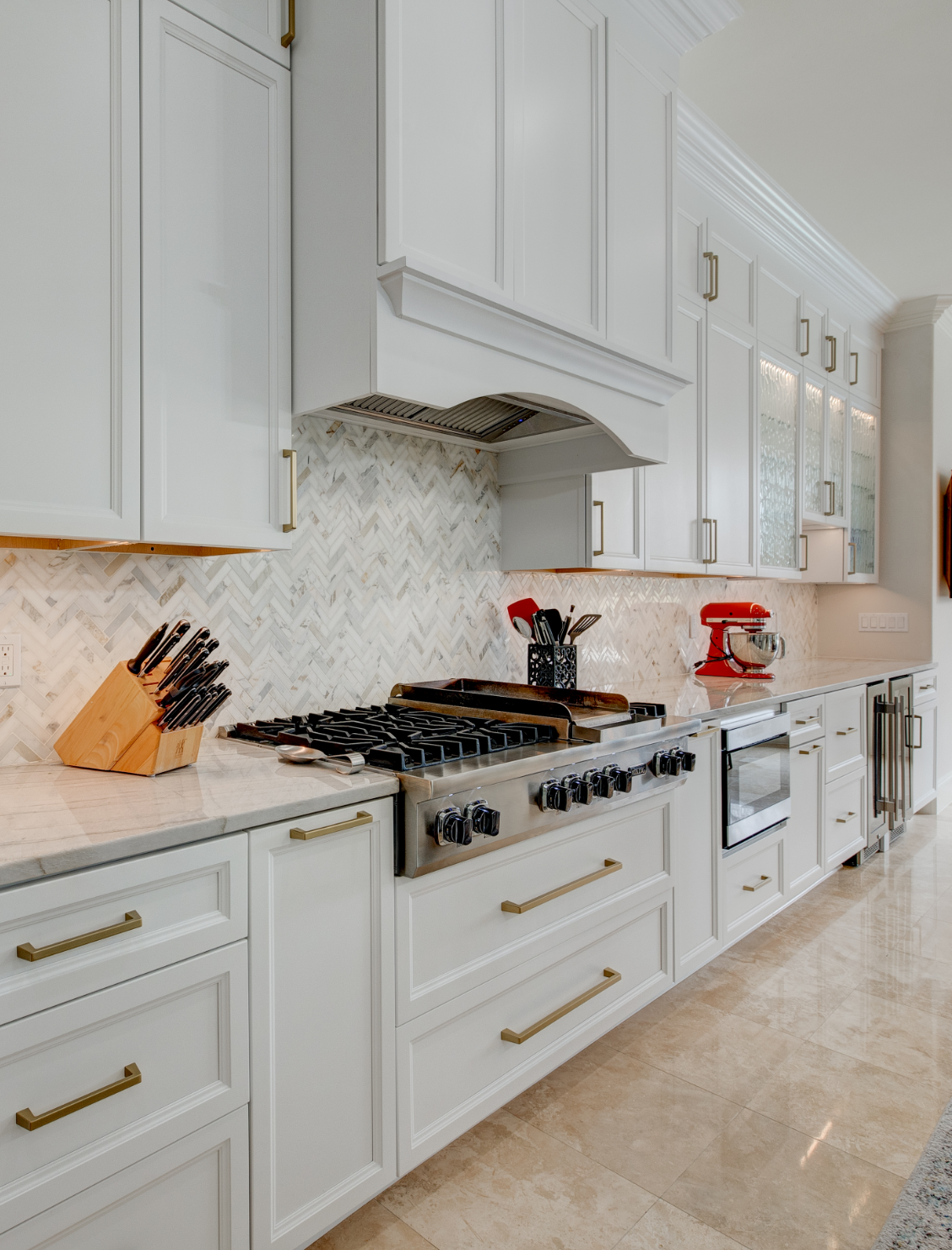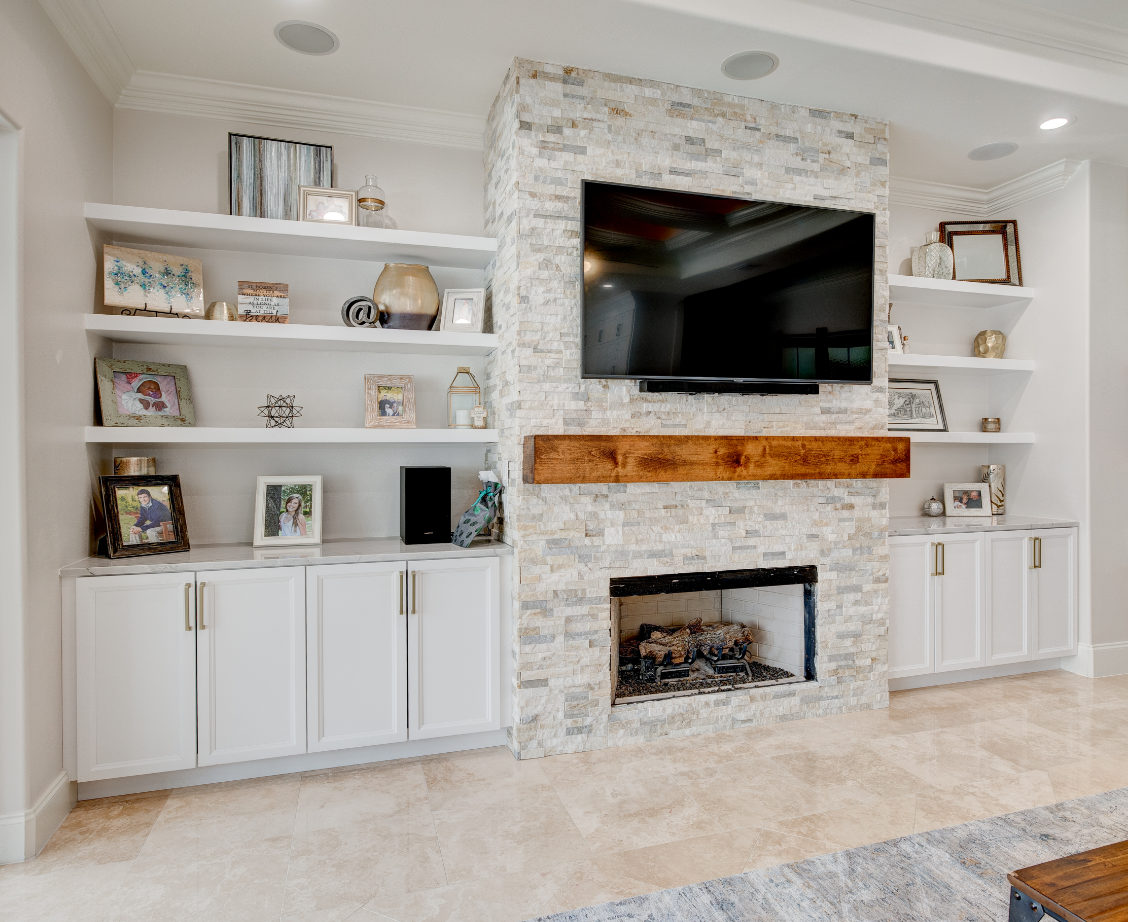 The chosen cabinetry truly maximized the design of the space. The homeowner chose the Long Beach cabinets from Bishop cabinets in Nordic white, a timeless style. Above and under cabinet lighting was installed for soft and functional visibility.